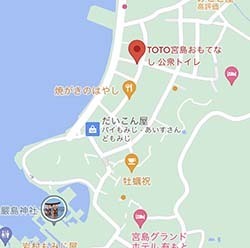 現在は、連絡船宮島ターミナル広場出入り口に設置されております。また、最近出来ました商店街参道中間地点に観光案内所と御手洗(TOTO宮島おもてなしトイレ)が設けられ、そちらで処理が出来ます。世界自然遺産での穏やかなひとときをお過ごし下さいませ。ただ、足元に広がる鹿のフンはご愛嬌でございますね♪