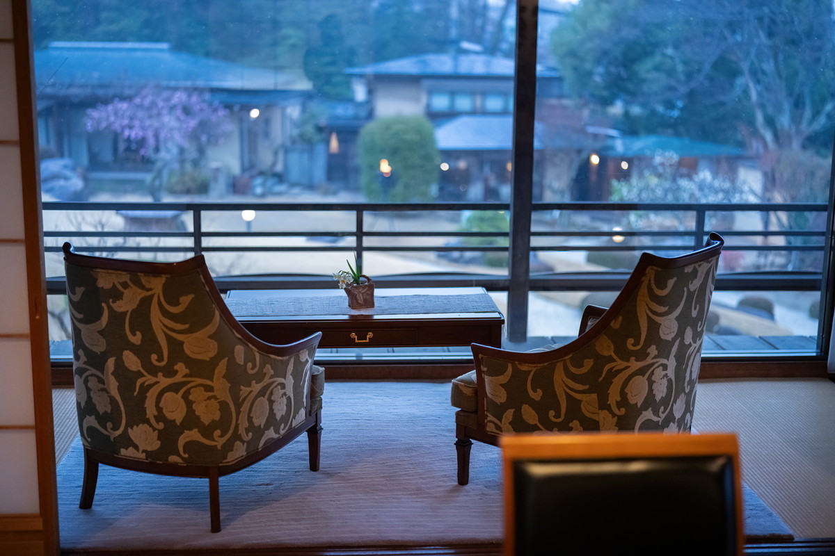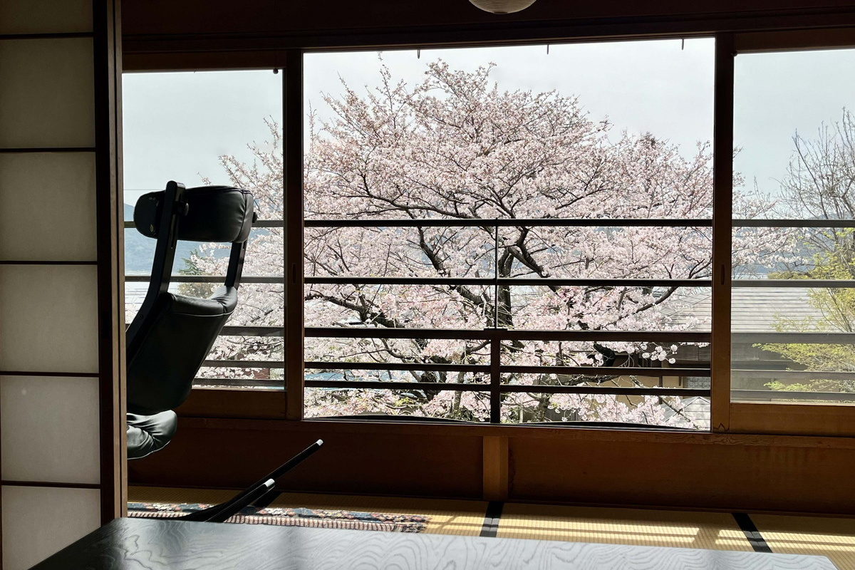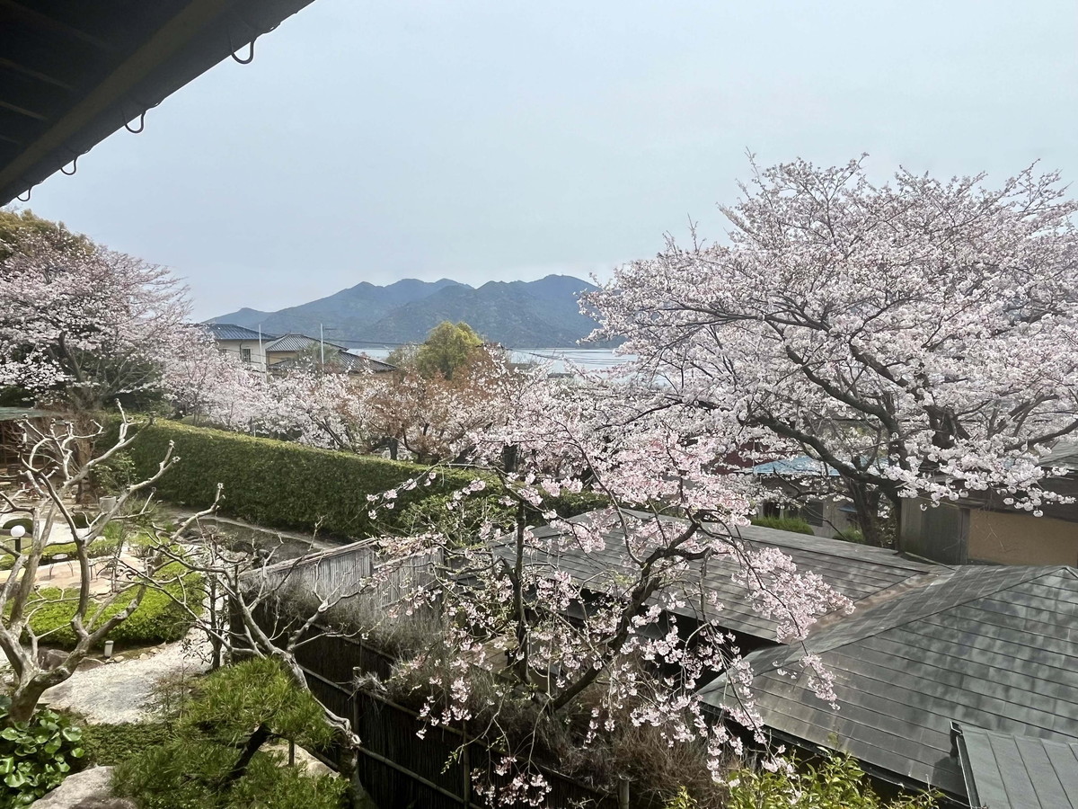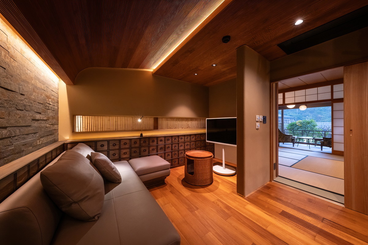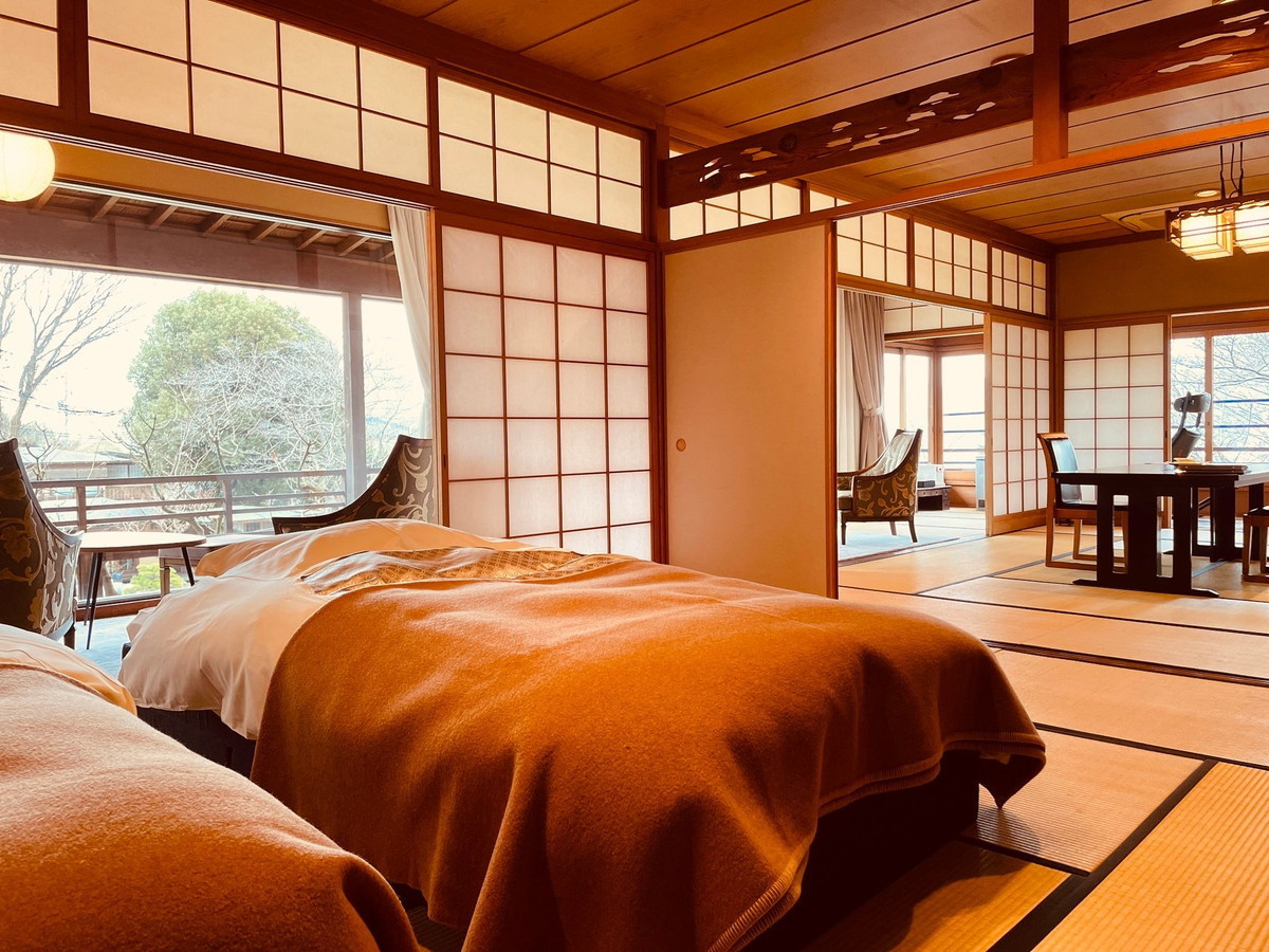 This room was constructed in a raised-floor style that projects into the garden. It contains a total of 43 tatami mats, and is a large room suitable for families. The large windows offer a panoramic view of the sea, mountains, sky, and garden. In springtime, a beautiful vista of cherry blossoms can be seen.