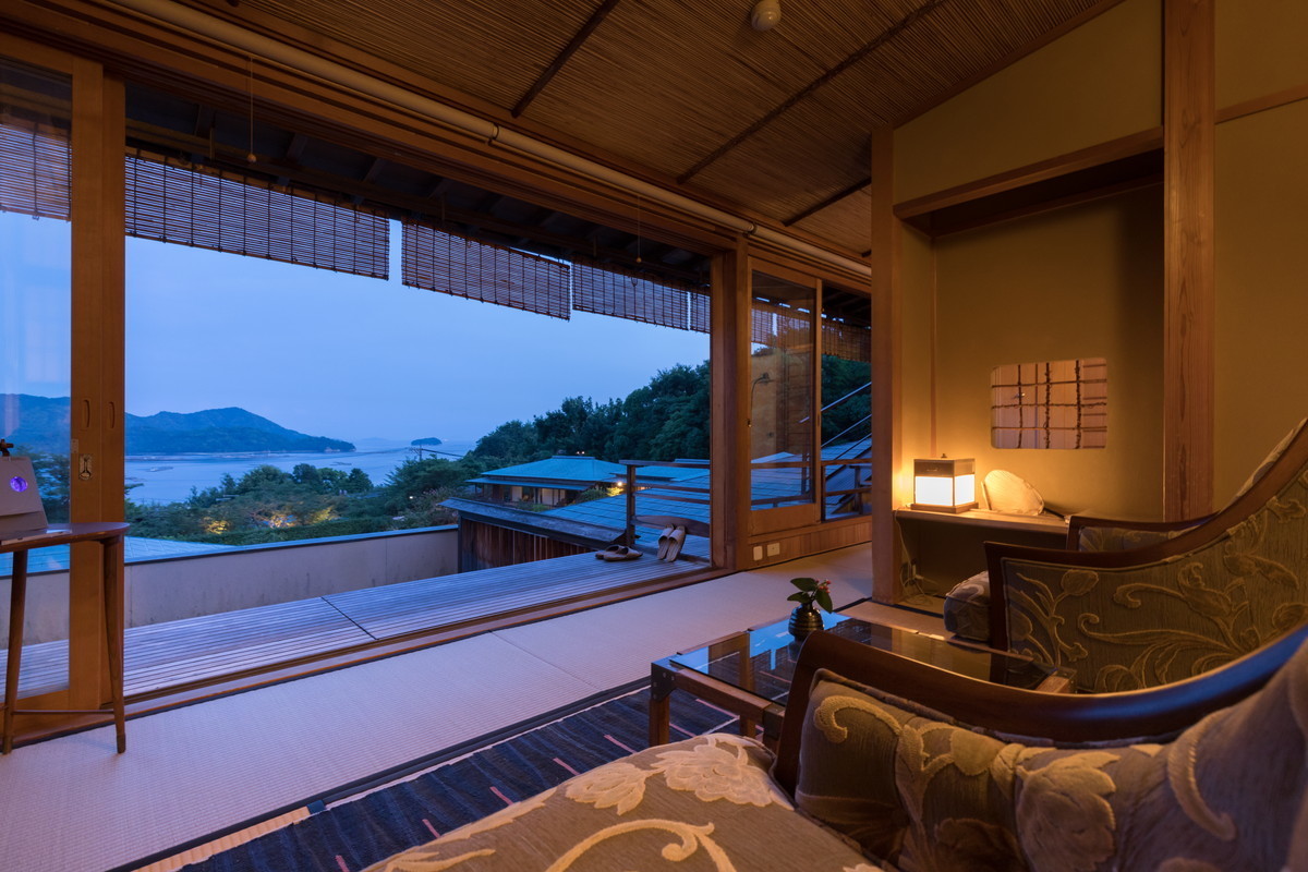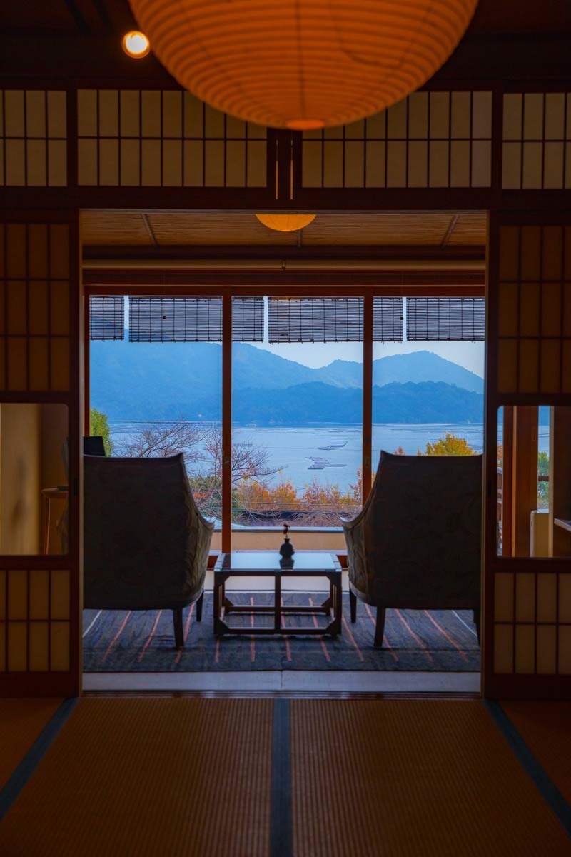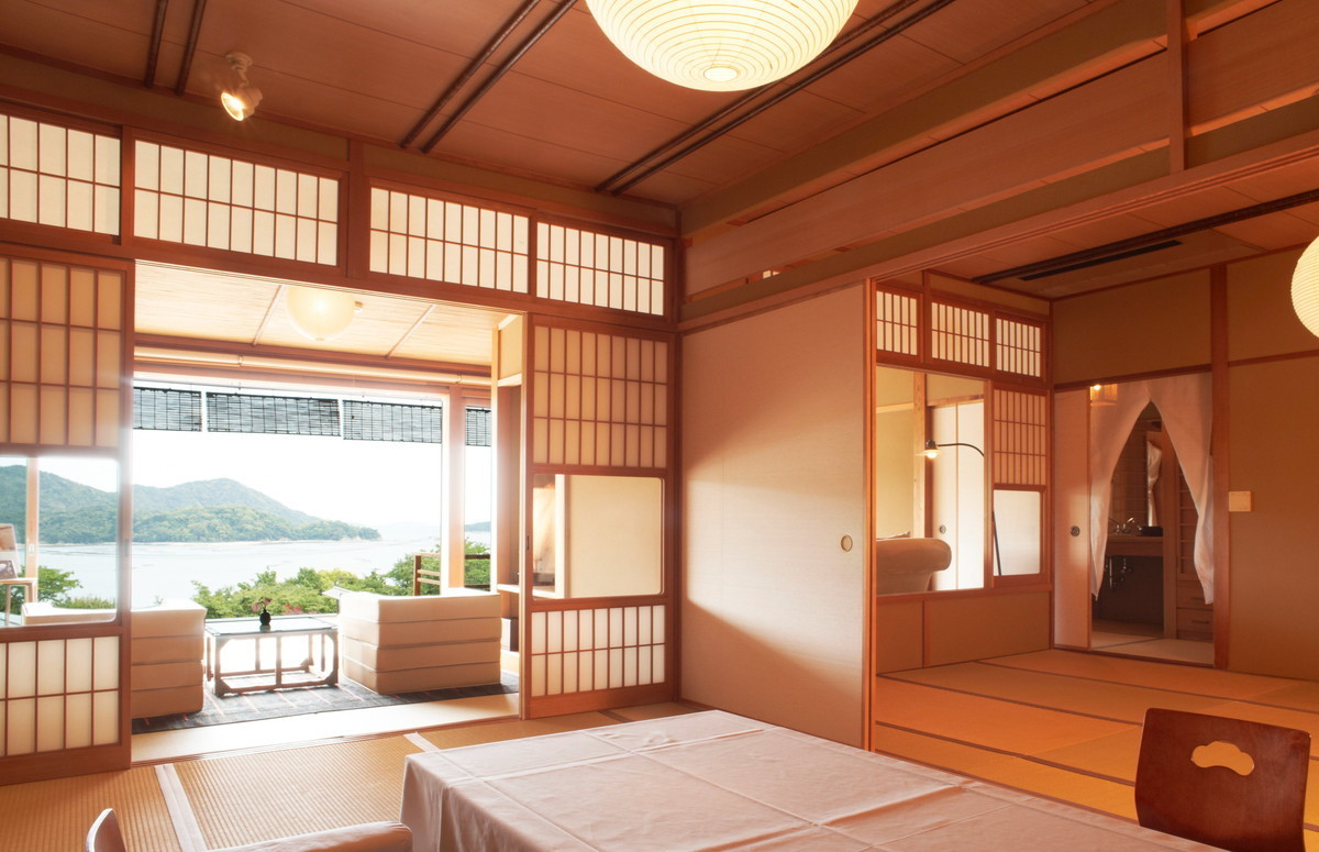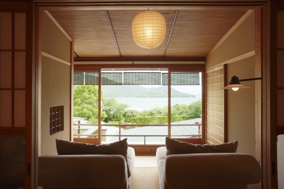 This is the 2F room (main building) with two large rooms. All three of the 2F rooms have ocean views. On a clear day, you can see all the way to Oshima and Shikoku. This is the only room which provides a view of the islands of the Seto Inland Sea beyond Miyajima.