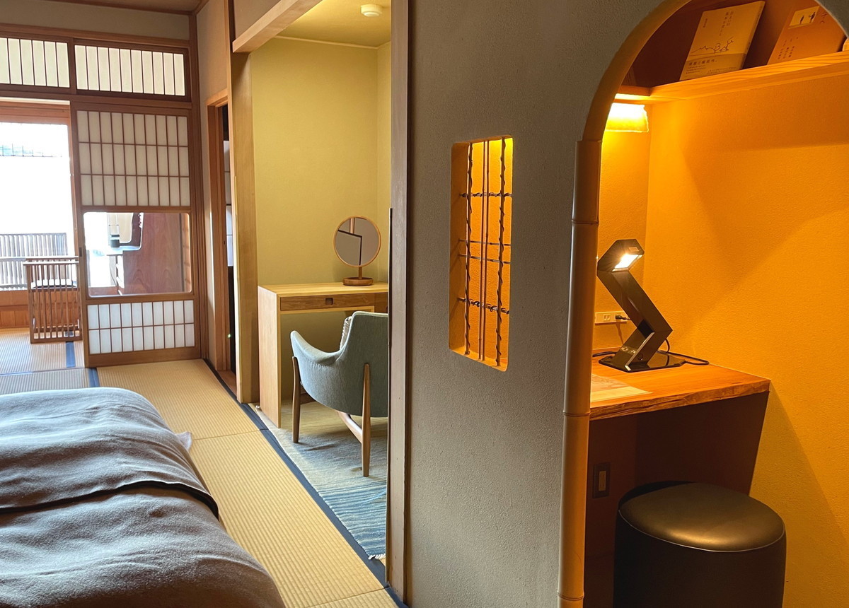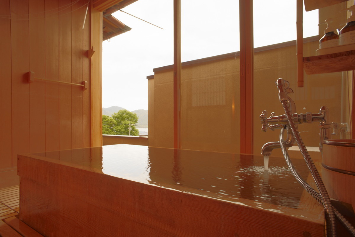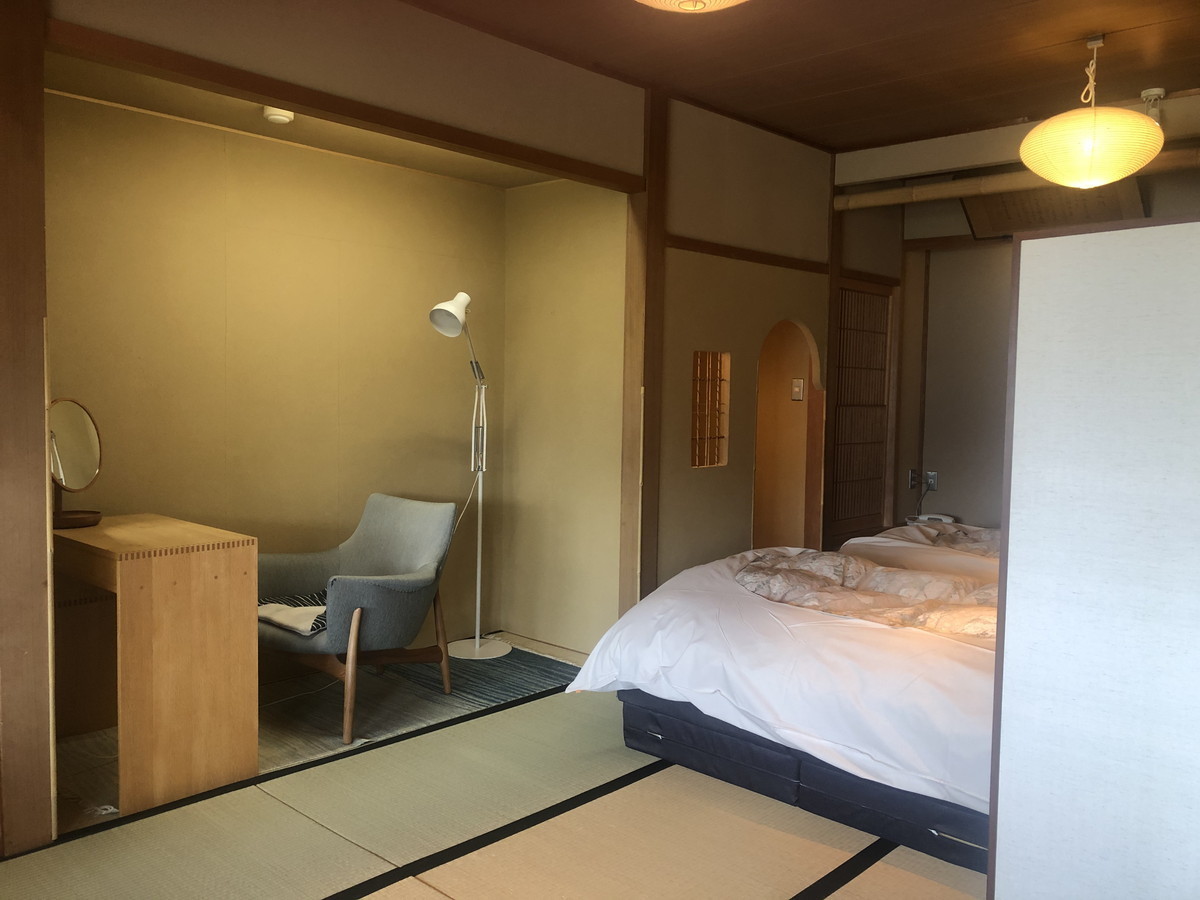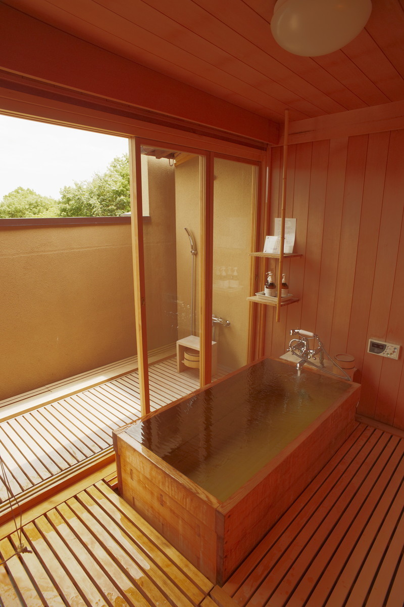 - 母屋の一番奥にあるため、大変落ち着きます。こちらのお部屋がお気に入りで毎年お泊りいただく方も。お風呂もプライベートを守りつつ、広い空を感じていただけるように配置しました。